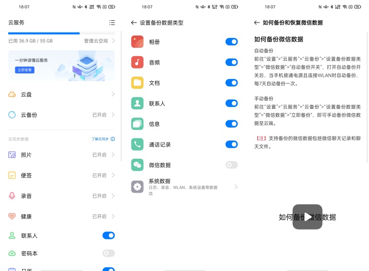 硬件廠商針對該問題推出了一些相應的功能。例如小米在系統(tǒng)中提供了“微信專清”的功能,幫助用戶清理一些不必要的緩存,包括訂閱號圖片緩存、小程序緩存和游戲圖片緩存等等,以此降低微信聊天記錄的體積,降低聊天記錄轉移時間。而 OPPO 則在 ColorOS 11 中提供了微信聊天記錄云備份功能,用戶在云服務中開啟后,便能每隔 7 天備份一次。OPPO 稱 ColorOS 11 的安全密鑰結合了硬件 TEE 與云端加密雙重方案,保證端到端的加密性。