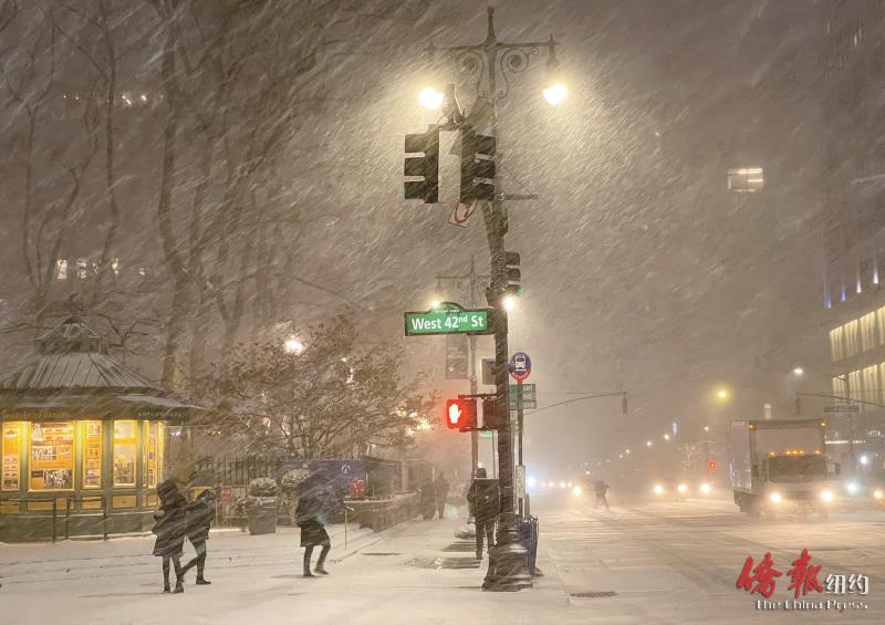 ①行人在暴風(fēng)雪中穿越42街第六大道路口。