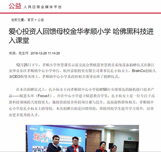 多份公開報道顯示,孝順鎮(zhèn)中心小學(xué)所用的頭環(huán),并不是學(xué)生或者學(xué)校購買的,而是“愛心投資人”捐贈的。2018年12月,杭州嘉銀投資有限公司董事長孔小仙向孝順鎮(zhèn)中心小學(xué)捐贈了50臺賦思頭環(huán),并在中心小學(xué)建立了賦思教育學(xué)堂,讓每一位同學(xué)都能夠進行體驗。每個班級輪流體驗,每班為期一個月。