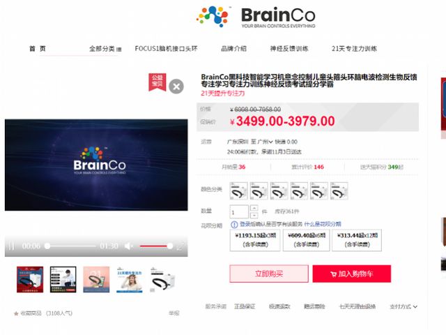 除了專用于課堂教育的頭環(huán)教育版之外,該公司也推出了家庭版頭環(huán)。名為“BrainCo賦思腦機接口頭環(huán)”的產(chǎn)品在網(wǎng)購平臺有售,售價3499-3979元。商品評論顯示,購買者多是希望提升孩子學(xué)習(xí)專注力的家長。