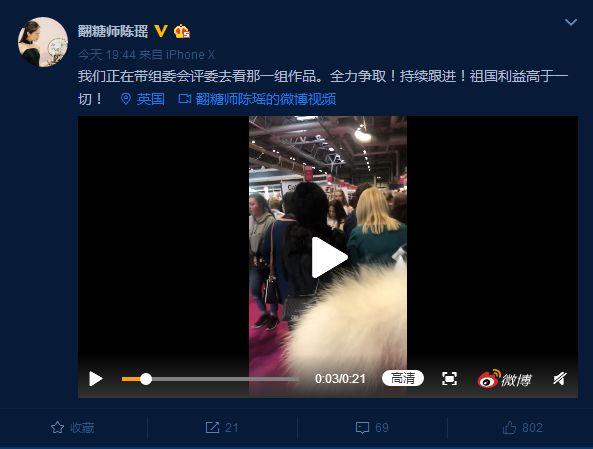 環(huán)球網(wǎng)記者隨后通過(guò)陳瑤的認(rèn)證微博聯(lián)系上了她本人,對(duì)方證實(shí)確有此事,并表示就比賽中出現(xiàn)宣揚(yáng)香港暴力的作品已向組委會(huì)舉報(bào),“不管結(jié)果如何,我們都會(huì)積極交涉”,因?yàn)椤白鎳?guó)利益高于一切!”