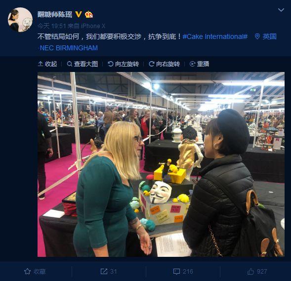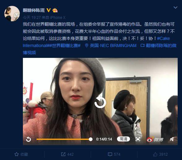 北京時(shí)間19時(shí)27分,@翻糖師陳瑤發(fā)布關(guān)于此事的第一條微博:“我們?cè)谑澜绶潜荣惖默F(xiàn)場(chǎng),在組委會(huì)舉報(bào)了宣傳港毒的作品。雖然我們也有可能會(huì)因此被取消參賽資格,花費(fèi)大半年心血的作品會(huì)付之東流,但那又怎樣?不論結(jié)果如何,這比比賽本身更重要!祖國(guó)利益面前,決!不!妥!協(xié)! ”