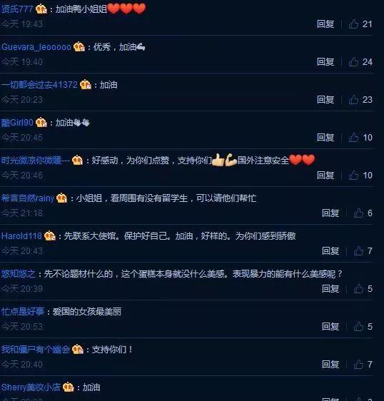 在陳瑤的博文下,許多網(wǎng)友紛紛留言表示支持,給姑娘們的行為點(diǎn)贊、打call,同時(shí)也提醒她們?cè)趪?guó)外注意安全。↓↓↓