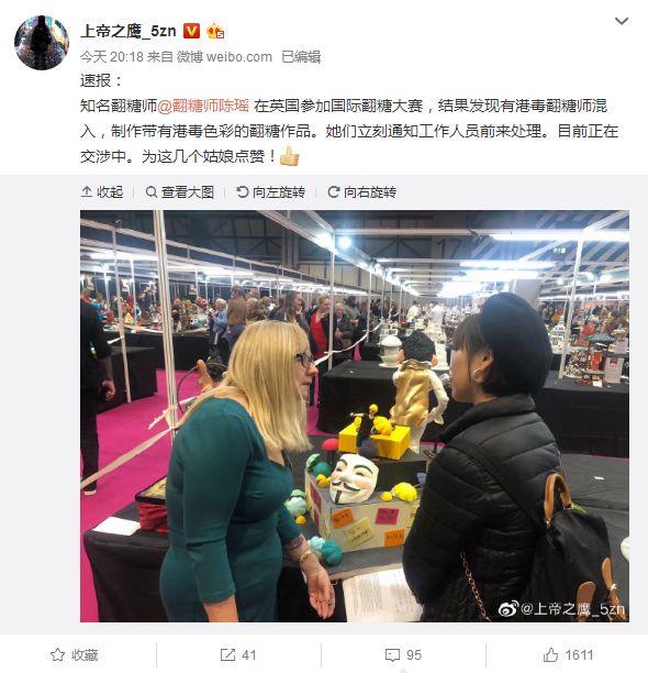 北京時(shí)間11月1日20時(shí)18分,網(wǎng)友“上帝之鷹”在微博上爆料,稱“知名翻糖師@翻糖師陳瑤 在英國(guó)參加國(guó)際翻糖大賽,結(jié)果發(fā)現(xiàn)有‘港獨(dú)’翻糖師混入,制作帶有‘港獨(dú)’色彩的翻糖作品。 陳瑤和其他四名來(lái)自中國(guó)的參賽選手立刻通知工作人員前來(lái)處理”?!吧系壑棥边€稱,目前她們與工作人員“正在交涉”。