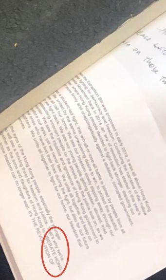 陳瑤在現(xiàn)場(chǎng)拍攝的照片顯示,該問(wèn)題作品不僅表現(xiàn)了香港街頭暴徒形象,疑似作品介紹的紙上還寫(xiě)著譴責(zé)港府港警的言語(yǔ),以及“解放香港”“革命”等字樣。