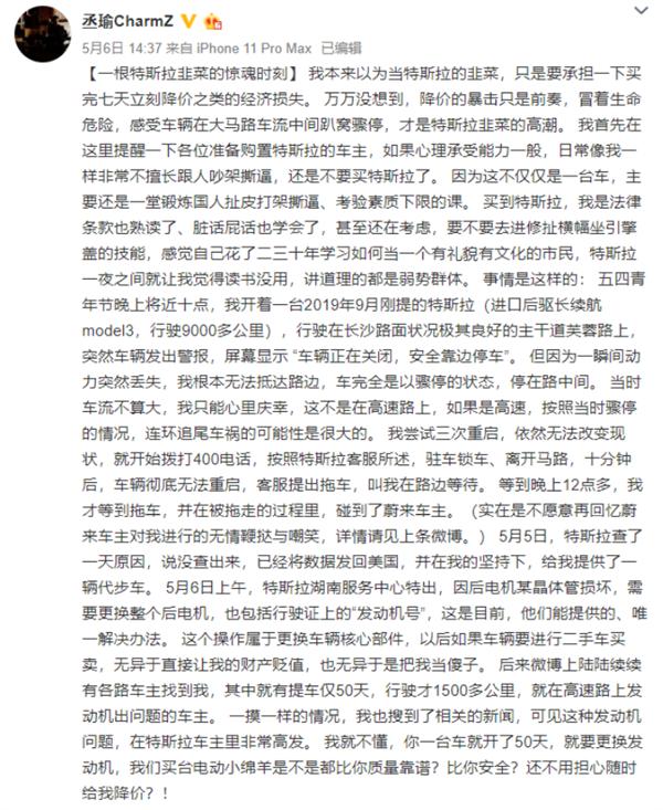 據(jù)國內媒體報道,5月6日,微博網(wǎng)友“丞瑜CharmZ ”發(fā)文《一根特斯拉韭菜的驚魂時刻》,其中稱,自己在2019年9月份購買的一輛進口后驅長續(xù)航版Model 3,在行駛途中,突然出現(xiàn)失速驟停,造成嚴重的人身安全隱患。