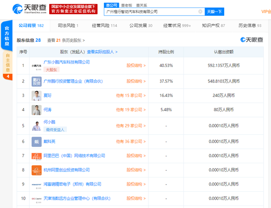 天眼查股東信息顯示,廣東小鵬汽車科技有限公司持股40.53%,為該公司最大股東;廣州鵬行投資管理企業(yè)(有限合伙)持股37.57%,為該公司第二大股東。
