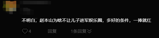 還有人不明白趙本山為什么也不順勢讓兒子進入娛樂圈,這個網(wǎng)友覺得趙一楠“多好的條件,一捧就紅”。娛樂圈的星二代不少,但大紅大紫甚至超越父輩的卻不多,一捧就紅的明星可能需要外貌、運氣、作品等的各種加持,這些條件綜合前來不簡單。